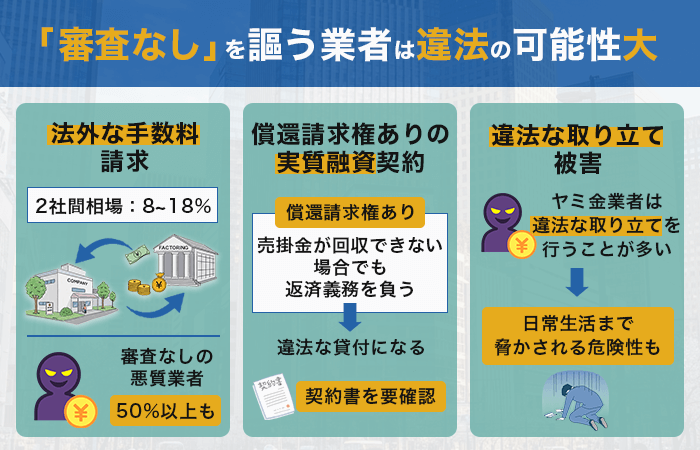 繰り返すように、審査なしのファクタリングは存在しません。審査なしを謳う業者は違法の可能性が高いため、絶対に利用しないでください。