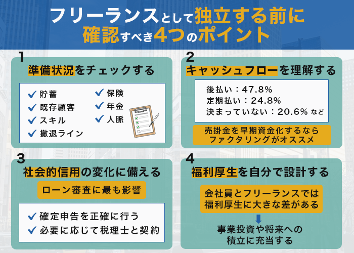 厳しい環境のなかでも、成功しているフリーランスには共通点があります。ここでは、生き残るために必要な4つの条件を整理します。