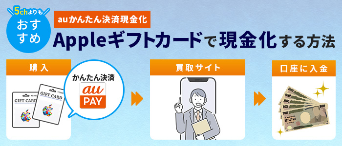 5chで紹介されているauかんたん決済方法で安全なのは、Appleギフトカードを使った方法です。auかんたん決済でAppleギフトカードを購入して、買取サイトに売却することで現金化ができます。