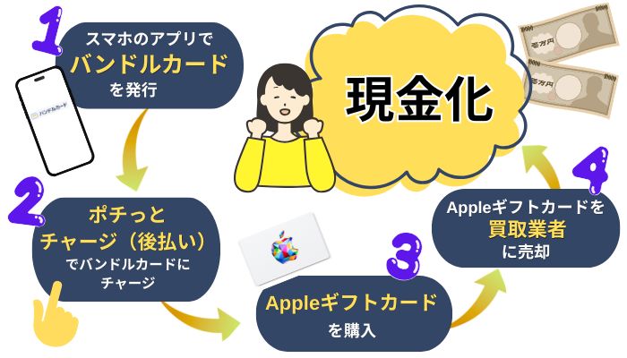 知恵袋の回答よりもおすすめなのは、Appleギフトカードを使ったバンドルカード現金化です。バンドルカードでAppleギフトカードを購入して、買取サイトに売却することで現金化ができます。