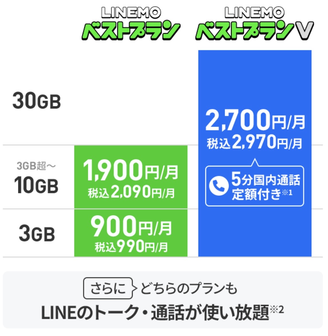 LINEMOには、月間30GBのギガ容量を持つLINEMOベストプランVと、月間最大10GBと中容量タイプのLINEMOベストプランがあります。