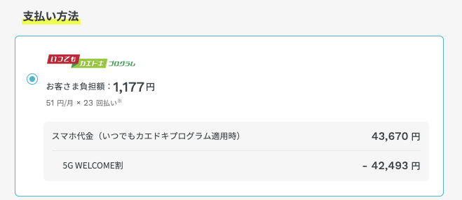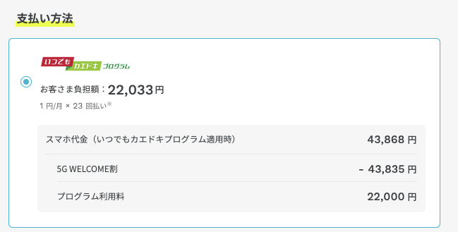 2026年3月5日以降にいつでもカエドキプログラムを利用してスマホを購入した場合、最大22,000円のプログラム利用料がかかるようになりました。