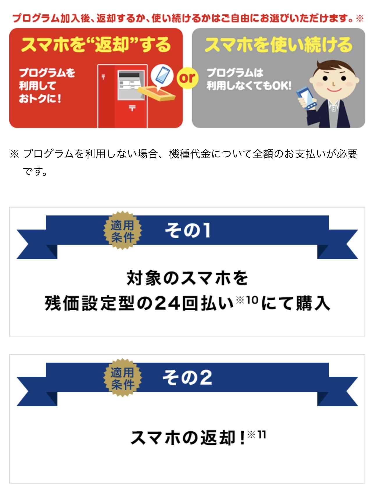 1〜23ヶ月目までに機種を返却すると、残価(24ヵ月目の支払い金額)が免除される点は同じです。