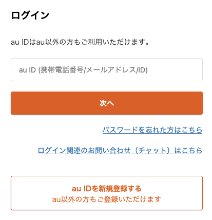 au IDまたは注文番号とご注文履歴の確認用パスワードを入力してログインする