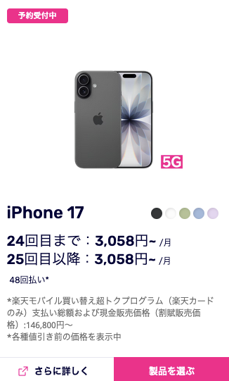 iPhone 17 256GBモデルをキャリアから購入する場合、楽天モバイルは一括払いの方がお得です。