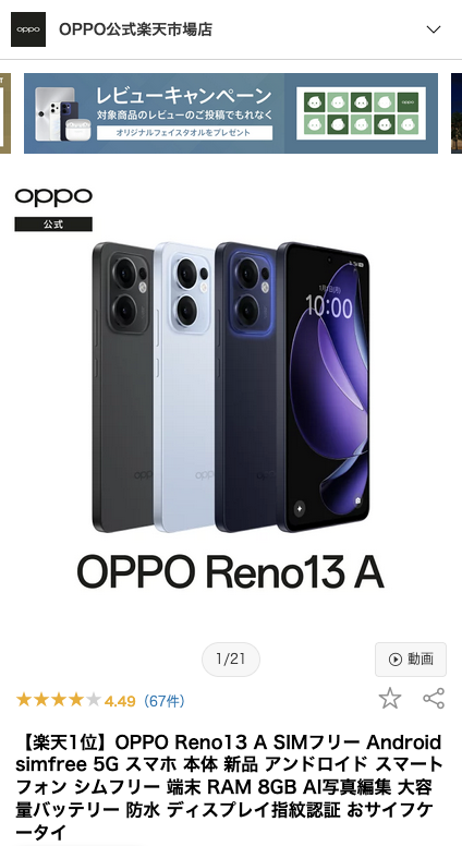 楽天市場のOPPO公式ストアなら、OPPO Reno13 Aを定価よりも安い価格で購入できます。