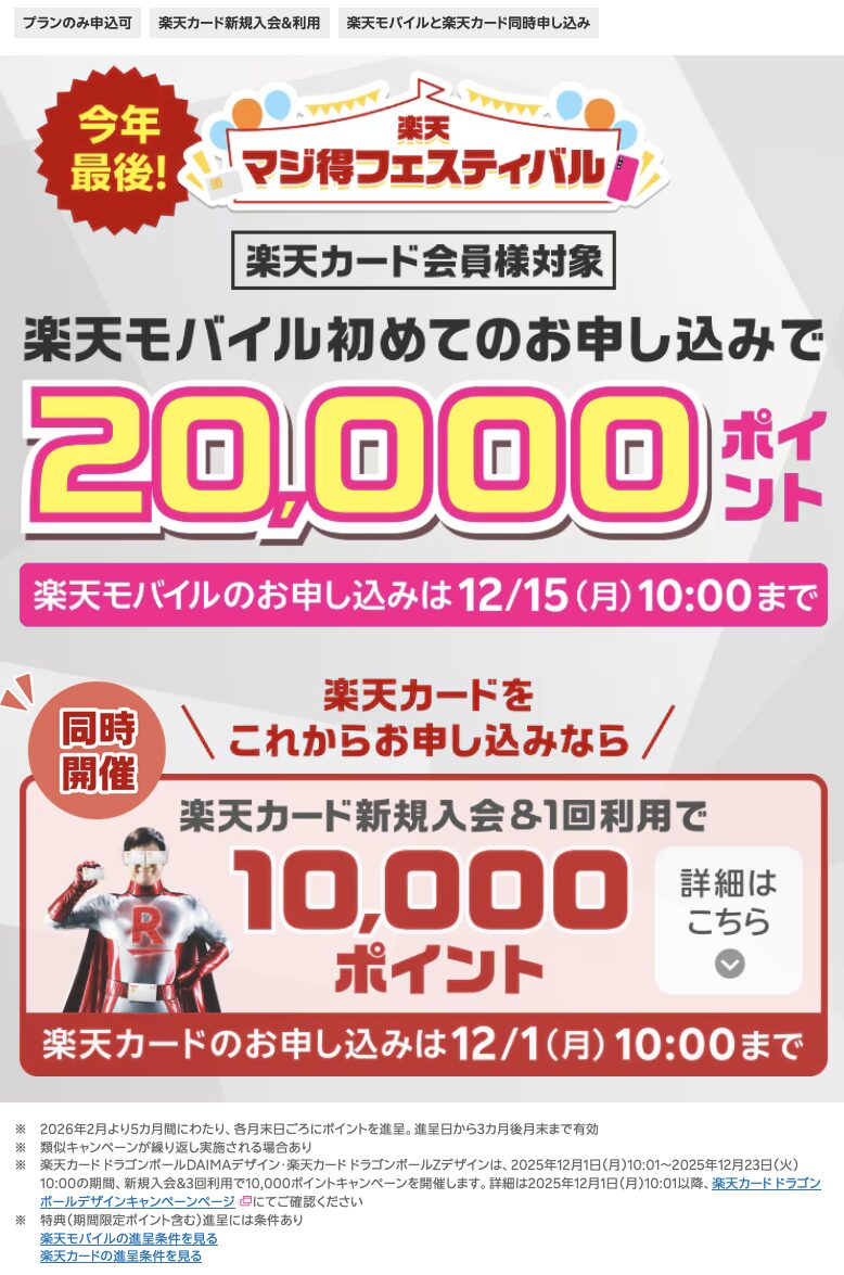 | 楽天マジ得フェスティバル | 20,000ポイント獲得 楽天モバイルを 初めての申込で対象 |