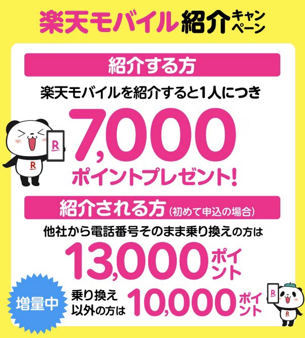 誰でも参加できる紹介キャンペーンでは、紹介者に7,000円相当、紹介された人には最大13,000円相当の楽天ポイントを付与。