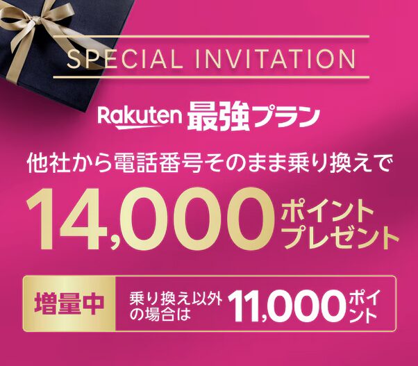 | MNPで転入の場合 | 13,000ポイント獲得 初めて楽天モバイルを 申し込みの場合のみ。 1回線分のみ適用 |