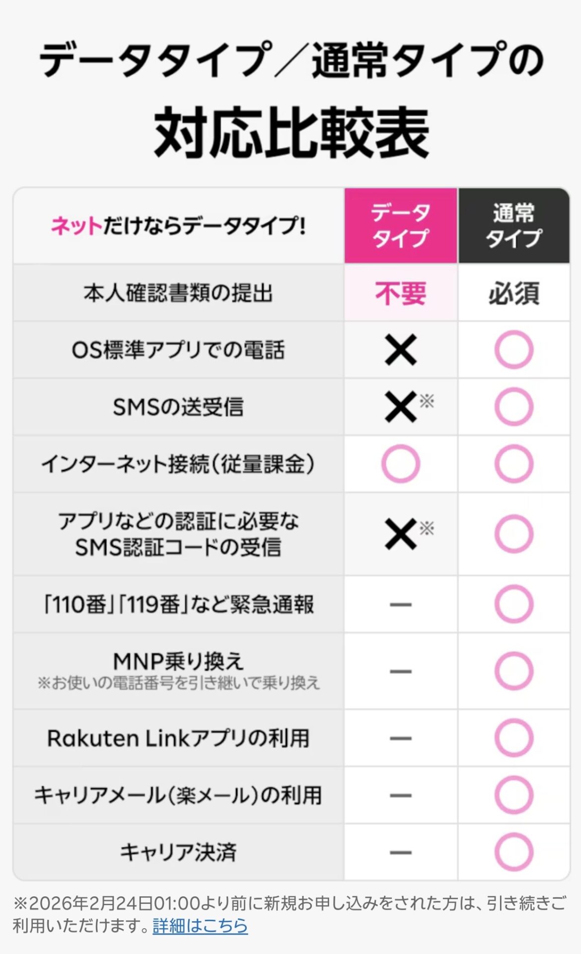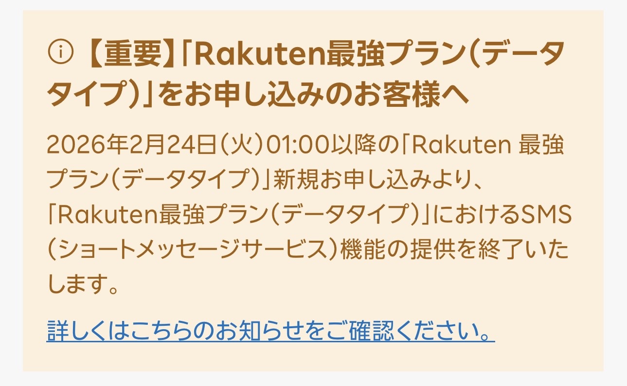 楽天モバイルのデータタイプは2026年2月24日申込分からSMS非対応にサービス内容が変更されました。