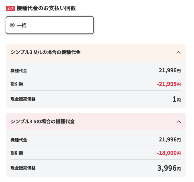 - 契約時にシンプル3 Sを選ぶと一括1円→一括3,996円に変わる
