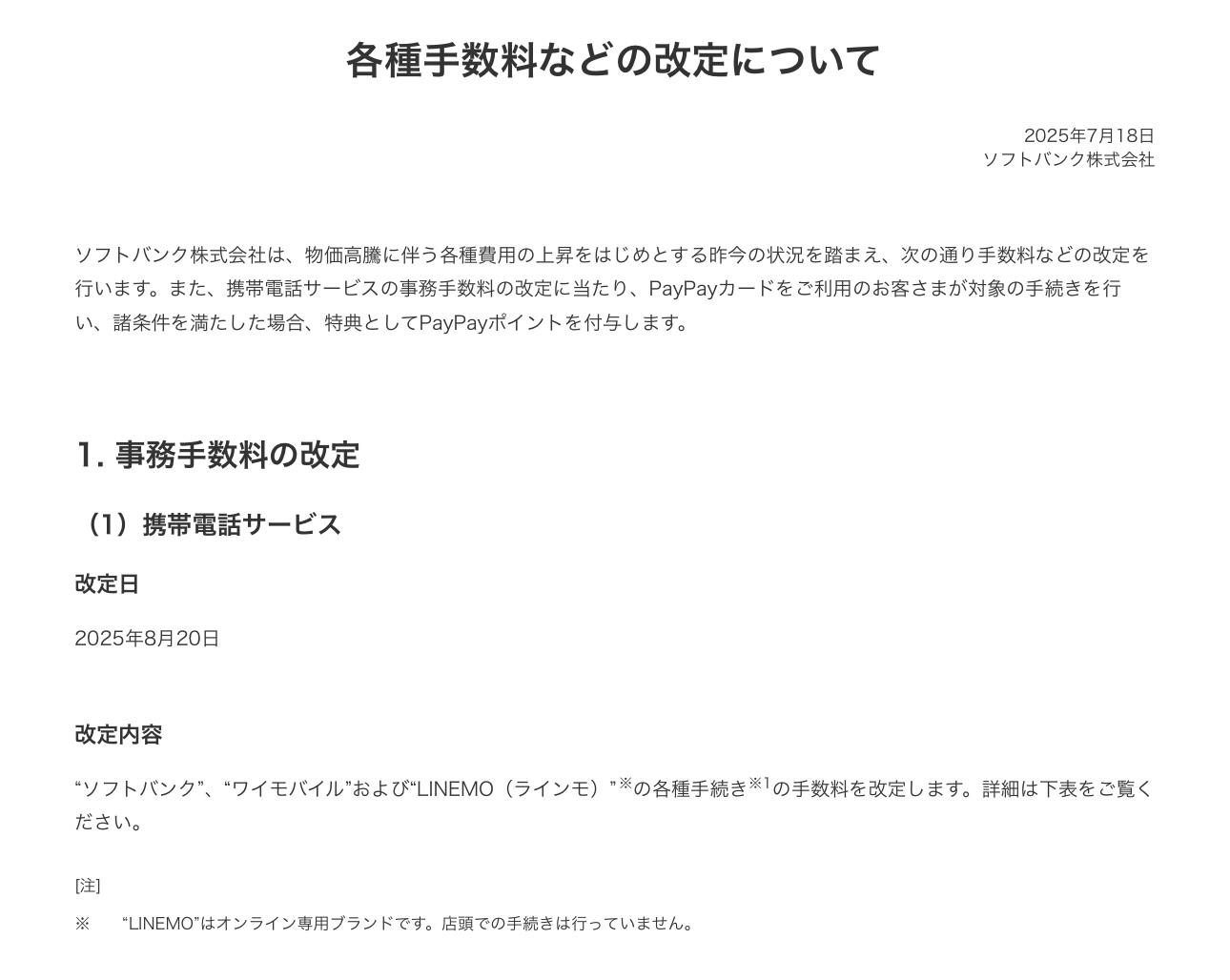 ソフトバンク株式会社は、ワイモバイル店舗やオンラインストア利用時に発生する事務手数料を値上げすることを発表しました。