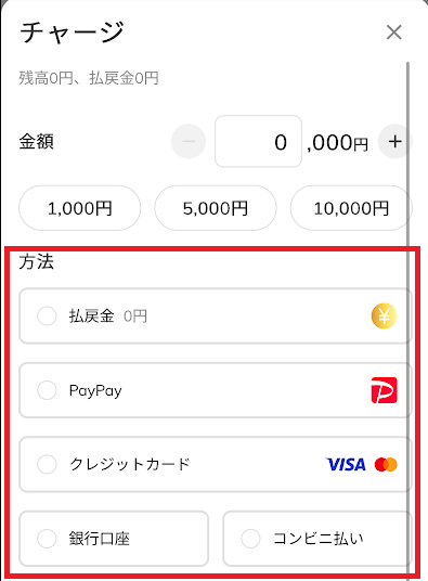 払戻金は下限も上限もなし、その他はすべて1,000円から999,000円の範囲内でチャージできます。